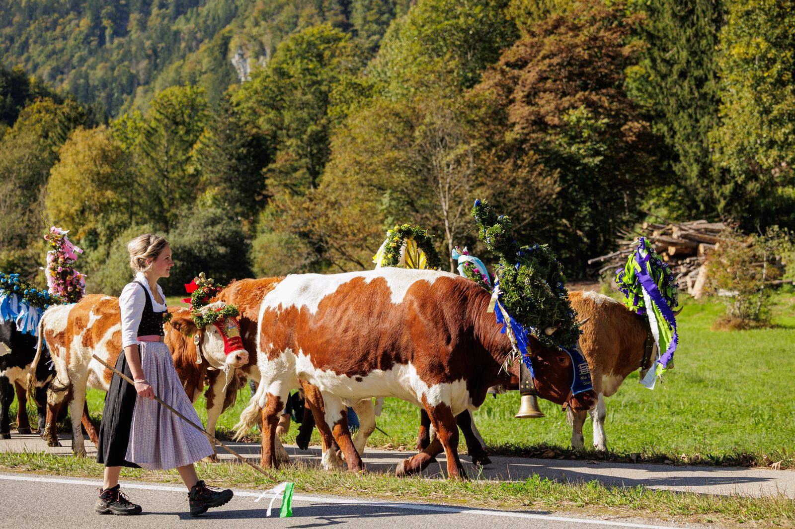 Der aufwendige Kopfschmuck dafür wird von den Sennleuten und den Almbauern und vielen fleißigen Helfern in traditioneller Handarbeit gefertigt, mit Bergblumen und Papierbändern. Viel zu schade zum Wegwerfen – nach dem Almabtrieb kommen die Kränze in den Herrgottswinkel oder werden außen an die Stalltür genagelt.