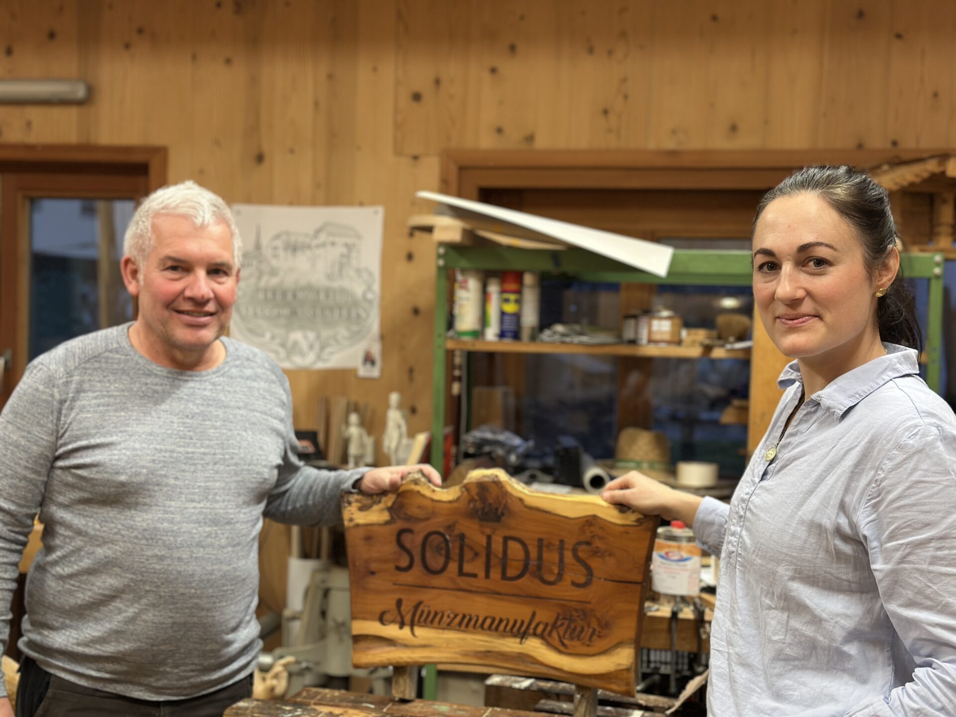 Franziska: Wir erstellen Münzen zu verschiedenen Anlässen. Von der Idee bis zur Umsetzung braucht es eine gewisse Zeit. Unsere Auftraggeber sind oft Kommunen und Gemeinden, aber auch Unternehmen wie KATEK in Grassau und die hiesigen Vereine. Für einzelne Personen sind es Aufträge wie Tauftaler und Schmuck mit Münzmotiven. Auf unserer Website findet man einen Teil unseres Angebotes: www.solidus-muenzmanufaktur.de. Nach und nach bauen wir den Shop aus. Wir arbeiten mit verschiedenen Gestaltern aus der Region wie Goldschmieden, Werkzeugmachern, Grafikern etc. zusammen.