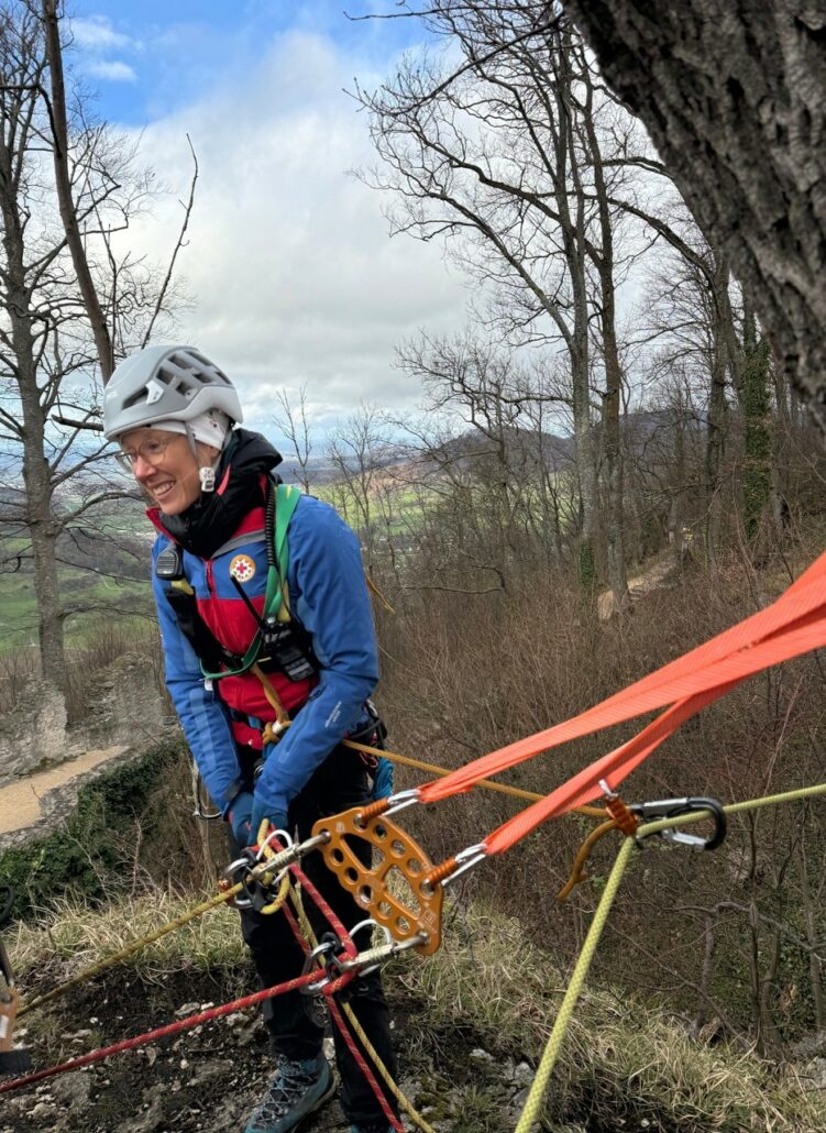Meinen Job bei BMW kann ich an 2-3 Tagen in der Woche vom Home Office aus ausüben. Bei einem etwaigen Einsatz stellt mein Arbeitgeber mich frei für dieses Ehrenamt. Meine große Stütze ist mein Lebensgefährte Matthias, der immer scherzhaft als der beste nicht-aktive Bergwachtler bezeichnet wird. Er hat mich in der gesamten Ausbildung unterstützt, für alle Prüfungen und Übungen mit mir gelernt und geht auch immer mit, wenn wir die Almen herrichten für die Bergmessen oder beim Schwenden. Er begleitet mich auch einmal im Monat zu den Bergwachtwochenenden auf der Schwäbischen Alb, zu denen ich immer noch fahre.