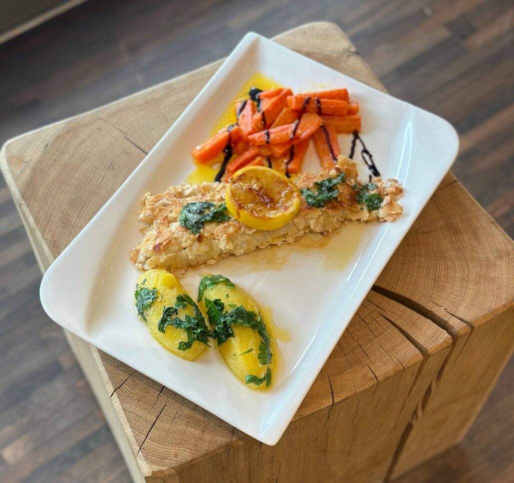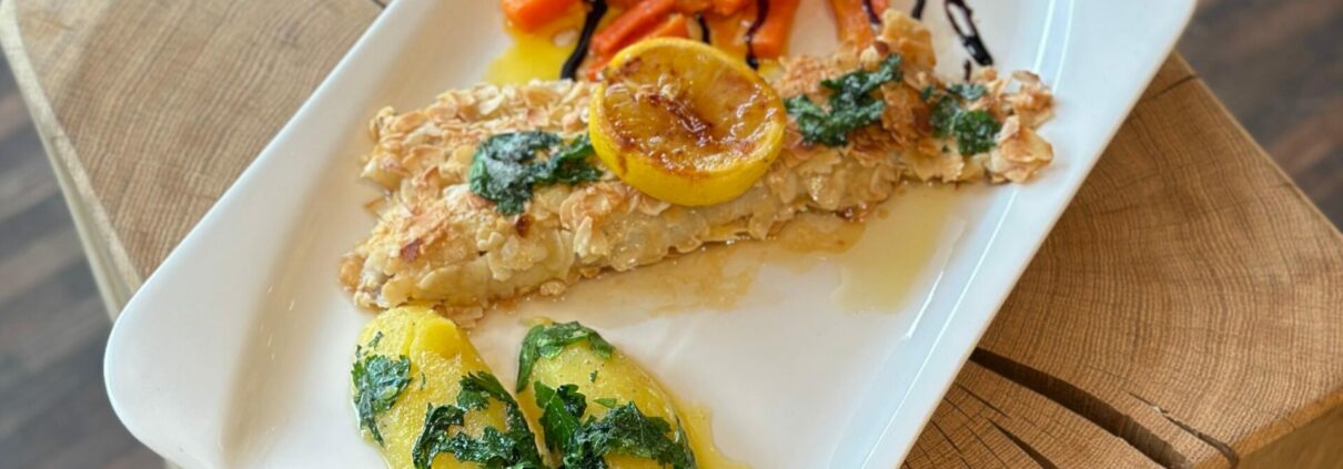 Bei uns im Achental wird – wie in vielen Regionen Bayerns – am Aschermittwoch traditionell Fisch serviert. Besonders beliebt ist ein raffiniertes Gericht aus dem Bistro am Rathaus in Unterwössen: Chiemgauer Fischfilet in knuspriger Mandelkruste mit glacierten Karotten und Petersilienkartoffeln.