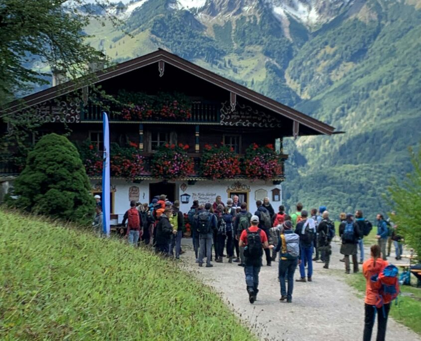 Danach stand für die Mitarbeiterinnen und Mitarbeiter der größten nationalen Bergsteigervereinigung der Welt neben einer Wanderung von Unterwössen über die Gscheuerwand zum Streichen unter Leitung von Elisabeth Keihl auch alternativ eine Führung durch Schleching und ein Einblick in den „Kräutergarten“ durch Altbürgermeister Fritz Irlacher auf dem Programm. Exklusiv für die Mitarbeiter des DAV öffnete anschließend die Familienstiftung Yvonne & Thomas Wilde und die Streichenfreunde den Berggasthof Streichen. Bei bestem Altweibersommer und mit Schmackerln aus der Küche des Raitner Wirt erfuhren die Ausflugsteilnehmer aus erster Hand, was das Bergsteigerdorf für die rund 1,4 Millionen Mitglieder des DAV zu bieten hat.