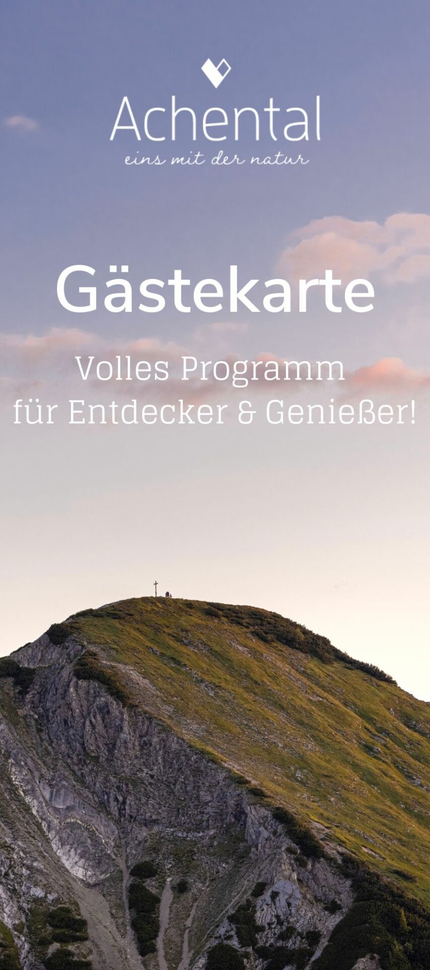 Karte vorzeigen und Vorteile genießen! Mit den neuen Leistungen der Achental Gästekarte erhalten Sie beim Besuch zahlreicher Attraktionen oder bei der Teilnahme vieler Aktivitäten im Achental und der gesamten Chiemsee-Chiemgau-Region Ermäßigungen oder sogar freien Eintritt. Eine Übersicht aller Leistungen finden Sie auf diesem Flyer.