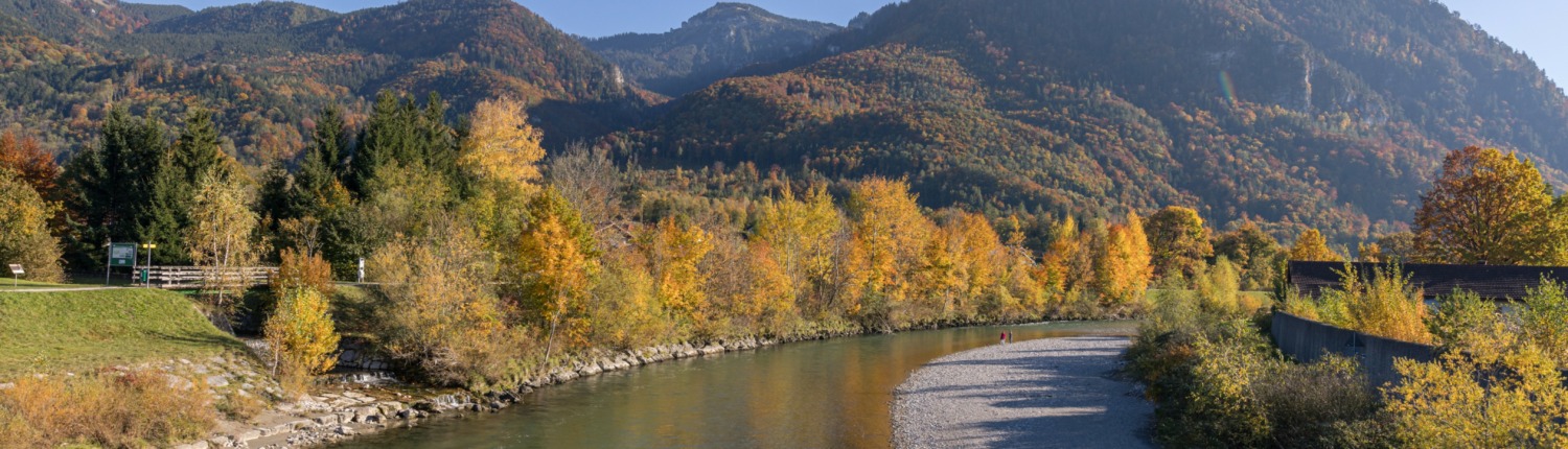 We start the hike in the Freiweidach district and head towards the Hochgern car park. It is a beautiful path that takes us along the edge of a meadow area on an almost flat stretch for about a kilometer towards Maquartstein. At the next signpost we turn left towards the Burgberg circular path and walk up a forest path through a sparse forest, slightly uphill. The next sign leads us to the right along the circular path. Soon we come across houses and can see the castle in front of us. We can take the path leading up to the right past the church and castle entrance and then come back to Burgstrasse or alternatively continue straight on to Burgstrasse. On Burgstrasse we go downhill to the main road, turn right there and cross the historic bridge over the Ache. At the end of the bridge we find a staircase that we take down to the Achendammweg and we walk along this path to the next bridge, which we cross again. We follow the sign towards the Freiweidach circular path further and further and reach the starting point of our hike.