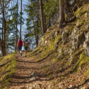 From the hiking car park we walk towards the Schnappenkirche, after 200 metres turn left onto the forest road and then after another 200 metres turn left onto the Schnappenweg according to the sign at the sign location at the “Fütterung”. Along this path we come to a junction that leads left to “Windeck”, but we continue the hike on the path to the Schnappenkirche. At the Scherbenstein the path makes a steep left turn. The comfortable, constantly slightly ascending path soon emerges from the forest and we can already enjoy the view of the upper Achental and the Chiemgau mountains. Below the Predigtstein the path mostly leads back through the forest to the historic Schnappenkirche. According to legend, the chapel was originally built as a memorial church for Count Marquart (builder of Marquartstein Castle), who was murdered on this mountain while hunting. It is not easy to tear yourself away from the magnificent view over the Chiemgau and the Chiemsee. The same path leads back into the valley to the starting point. With the help of the hiking signs we cannot miss the way.
