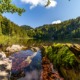 The path continues to the left into another forest area, follow the signs to the Kroatensteig trail. This is where the actual ascent begins on this historic smugglers’ path between Bavaria and Austria. First steadily uphill, after a few meters it gets steep. The path is easy to walk on, tricky spots on the mountain path are well secured and defused with ropes. The narrow trail leads down on the other side, past the old customs hut, in the direction of lake Taubensee. This beautiful mountain lake is called the eye of the Chiemgau, and it is wonderful to bathe in warm temperatures. The border between Germany and Austria runs right in the middle of the body of water.