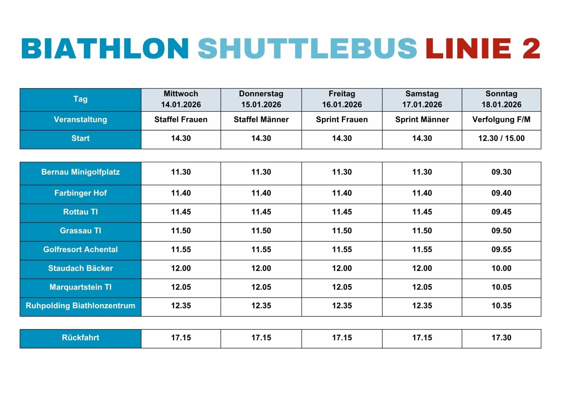 Während der Weltcup-Tage (14. bis 18. Januar 2026) sind die Parkmöglichkeiten in Ruhpolding stark eingeschränkt. Wir empfehlen die Anreise mit dem Shuttlebus oder öffentlichen Verkehrsmitteln.