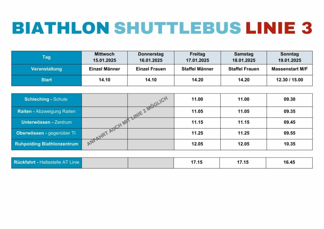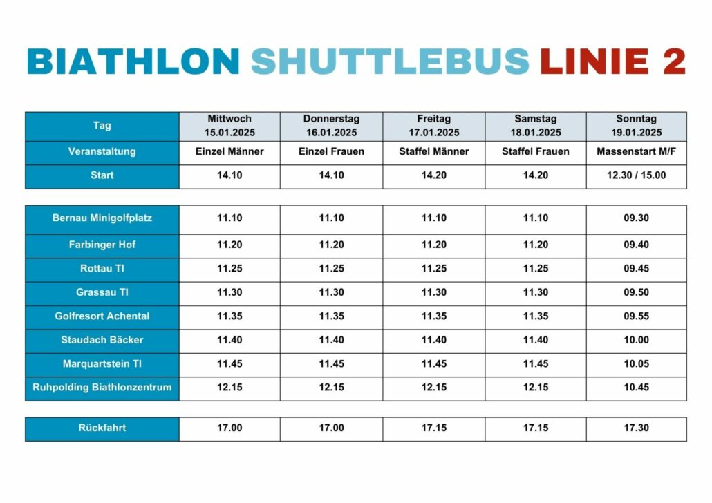 Der Shuttle-Bus ermöglicht die bequeme Anreise nach Ruhpolding. Die Haltestelle ist direkt an der Chiemgau Arena. Wegen der angespannten Parkplatzsituation in Ruhpolding während den Veranstaltungen empfehlen wir die Anreise mit den öffentlichen Verkehrsmitteln.