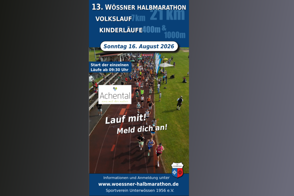 Am 16. August 2026 ist es wieder so weit: Der Wössner Halbmarathon lädt Läuferinnen und Läufer in das idyllische Unterwössen ein. Eine attraktive und abwechslungsreiche Strecke entlang der Tiroler Ache, umrahmt von den Chiemgauer Alpen, sorgen für abwechslungsreiche Runden.