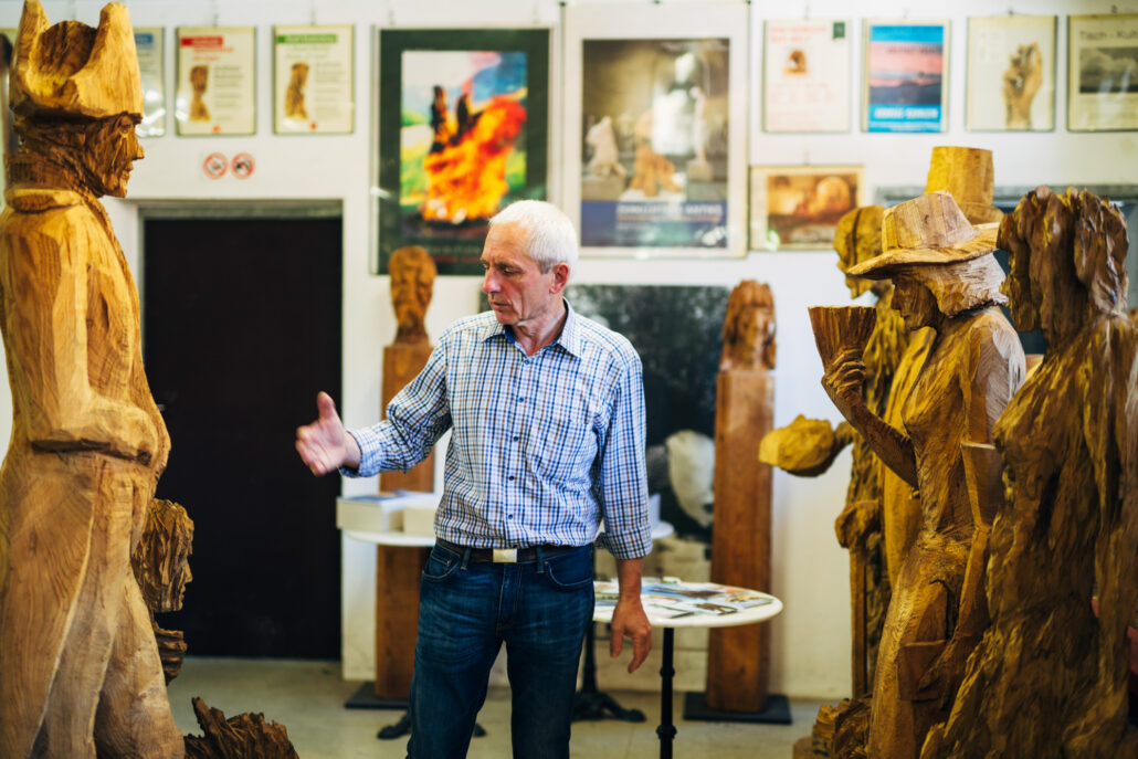 Andreas Kuhnlein schält nicht heraus mit Hohleisen, Klöpfel und Schnitzmesser, vielmehr bearbeitet er das Holz mit der Motorsäge. Er bedient sich der natürlichen Eigenschaft des Materials und betrachtet diese auch als wesentliche Komponenten seiner ästhetischen Aussage. Der Bildhauer aus Unterwössen ist international tätig und lädt in seine Werkstatt ein.