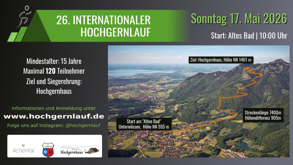Der 26. Internationale Hochgernlauf in Unterwössen findet am 17. Mai 2026 um 10:00 Uhr statt. Der Berglauf startet am Alten Bad, führt über 7,4 km und 905 Höhenmeter bis zum Hochgernhaus. Die Online-Anmeldung ist bis zum 10. Mai 2026 möglich. Alle Informationen und die Online Anmeldung findet Ihr auf unserer Webseite: www.hochgernlauf.de