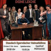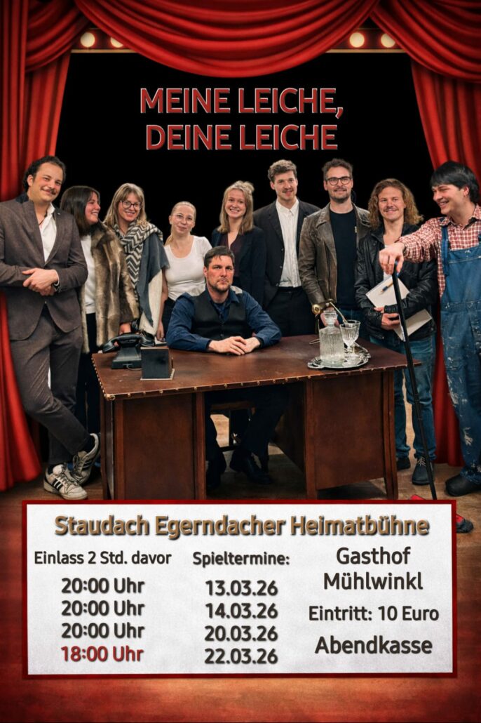 Meine Leiche, deine Leiche. Einlass 2 Std. davor. Um 20 Uhr im Gasthof Mühlwinkl. Eintritt 10 € (Abendkasse)