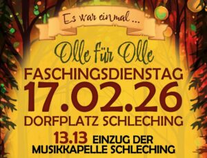 Am Faschingsdienstag verwandelt sich der Schlechinger Dorfplatz in ein buntes Märchenland.Eine Zaubershow, das Kasperletheater, Kettenkarusell, Bierkästenkraxeln mit der Bergwacht, Musik der Schlechinger Musikkapelle und vieles mehr lassen nicht nur Kinderherzen höher schlagen. Für das leibliche Wohl ist mit leckeren Speisen, Kaffee und Kuchen sowie erfrischenden Getränken gesorgt. Ein Fest für die ganze Familie.