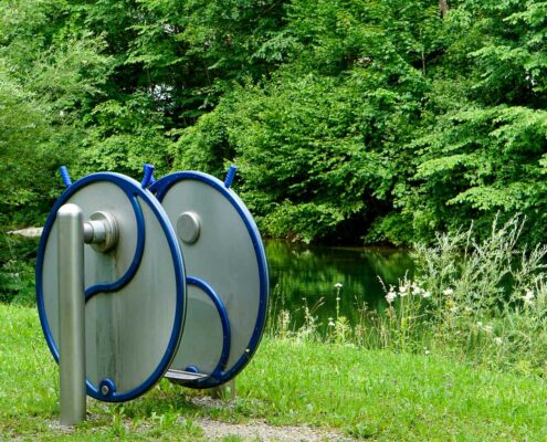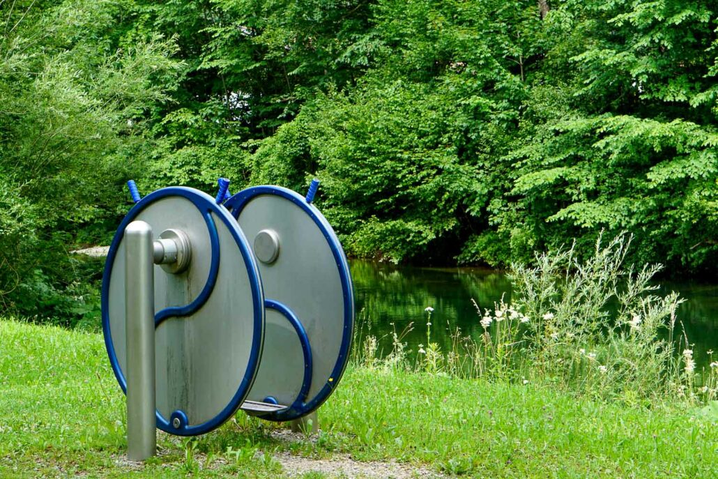 Direkt neben dem Kneippbecken befindet sich ein kleiner Trimm-Dich-Park mit drei verschiedenen fest installierten Trainingsgeräten inmitten der Natur.