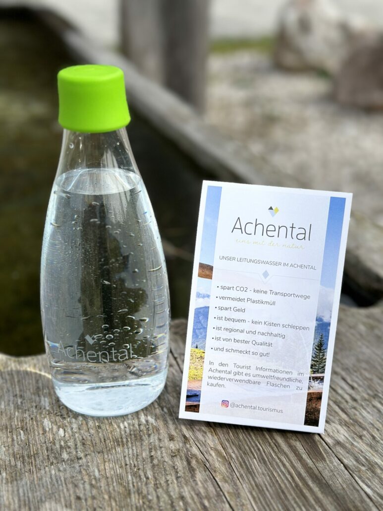 In den Tourist Informationen im Achental gibt es außerdem ab sofort umweltfreundliche, wiederverwendbare Flaschen aus Borosilikatglas (0,8 l) zu kaufen (siehe Bild anbei).