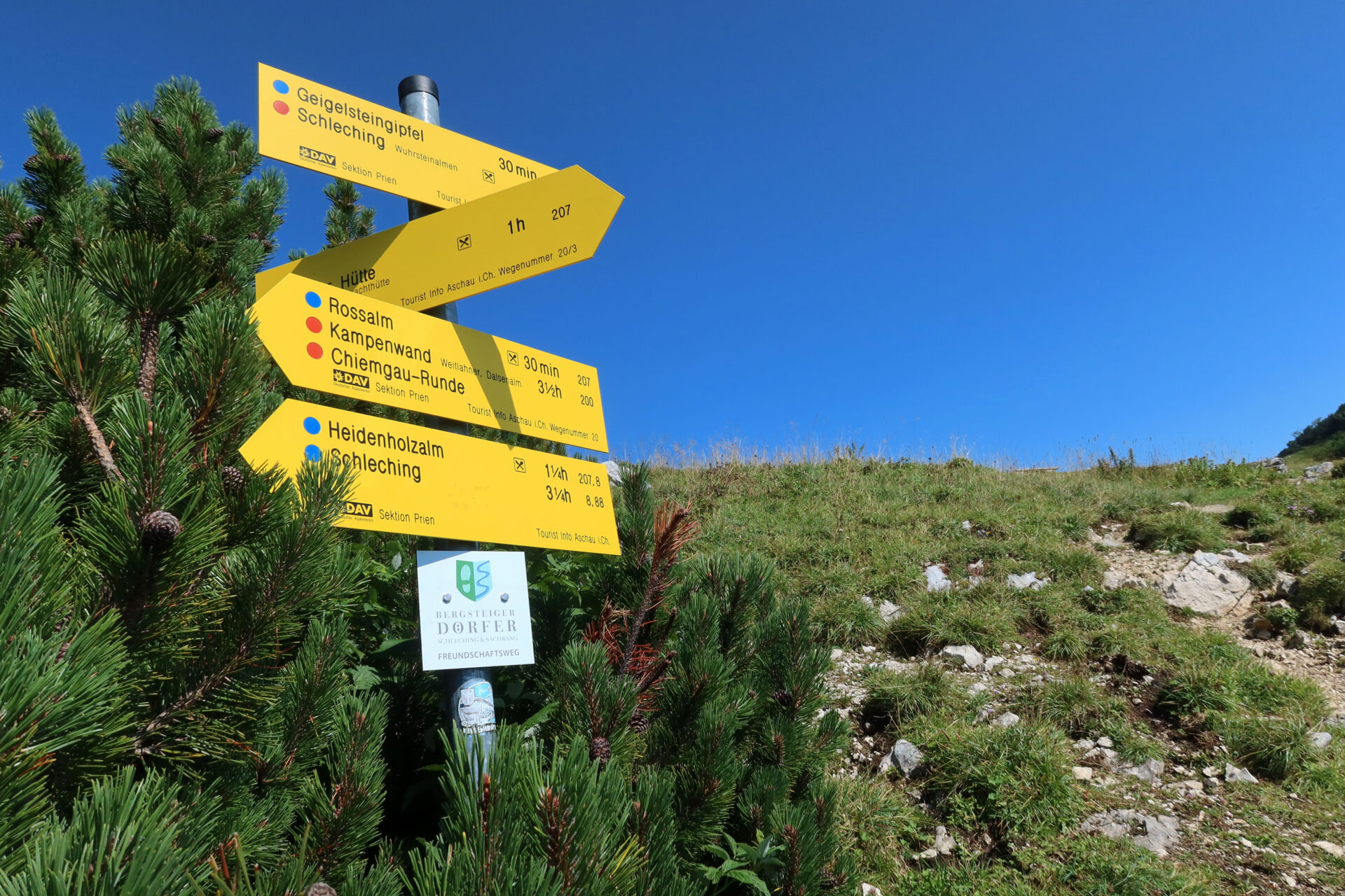 Südlich des Chiemsees tief eingebettet in den Chiemgauer Alpen – so nah und doch so unterschiedlich: Das Dorf Sachrang mit seinen 670 Einwohnern liegt auf 738 Metern im Priental westlich des Geigelsteins, in Schleching am Fuße des Berges auf der Ostseite des Achentals auf einer Höhe von 569 Metern leben rund 1.900 Einwohner. Die Luftlinie zwischen beiden am Talschuss gelegenen Dörfern beträgt gerade einmal 10,4 Kilometer, doch mit dem Auto ist die Strecke zwischen Sachrang und Schleching unter 30 Minuten nicht zu schaffen: Die Kampenwand mit ihrem 1.669 Meter hohen Berggipfel und dem markanten Gipfelkreuz muss weitläufig umfahren werden. Als Freundschaftsweg zwischen Sachrang und Schleching sind nun zwei Varianten ausgeschildert: Ein rund 19 Kilometer langer Weg mit dem Gipfel des Geigelsteins auf 1.808 Metern als höchstem Punkt, der in rund 7,5 Stunden zu bewältigen ist. Alternativ bietet sich die 16,5 Kilometer lange Wegstrecke über die Dalsenalmen mit dem höchsten Punkt auf 1.079 Metern an, die in knapp fünf Stunden zurückzulegen ist.