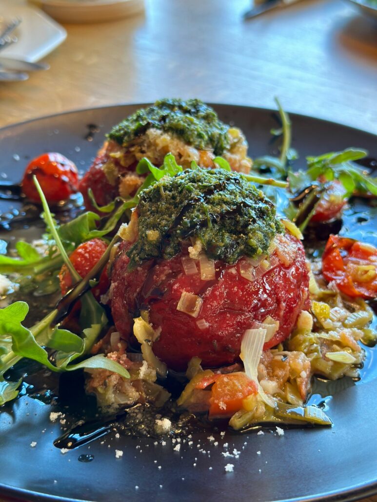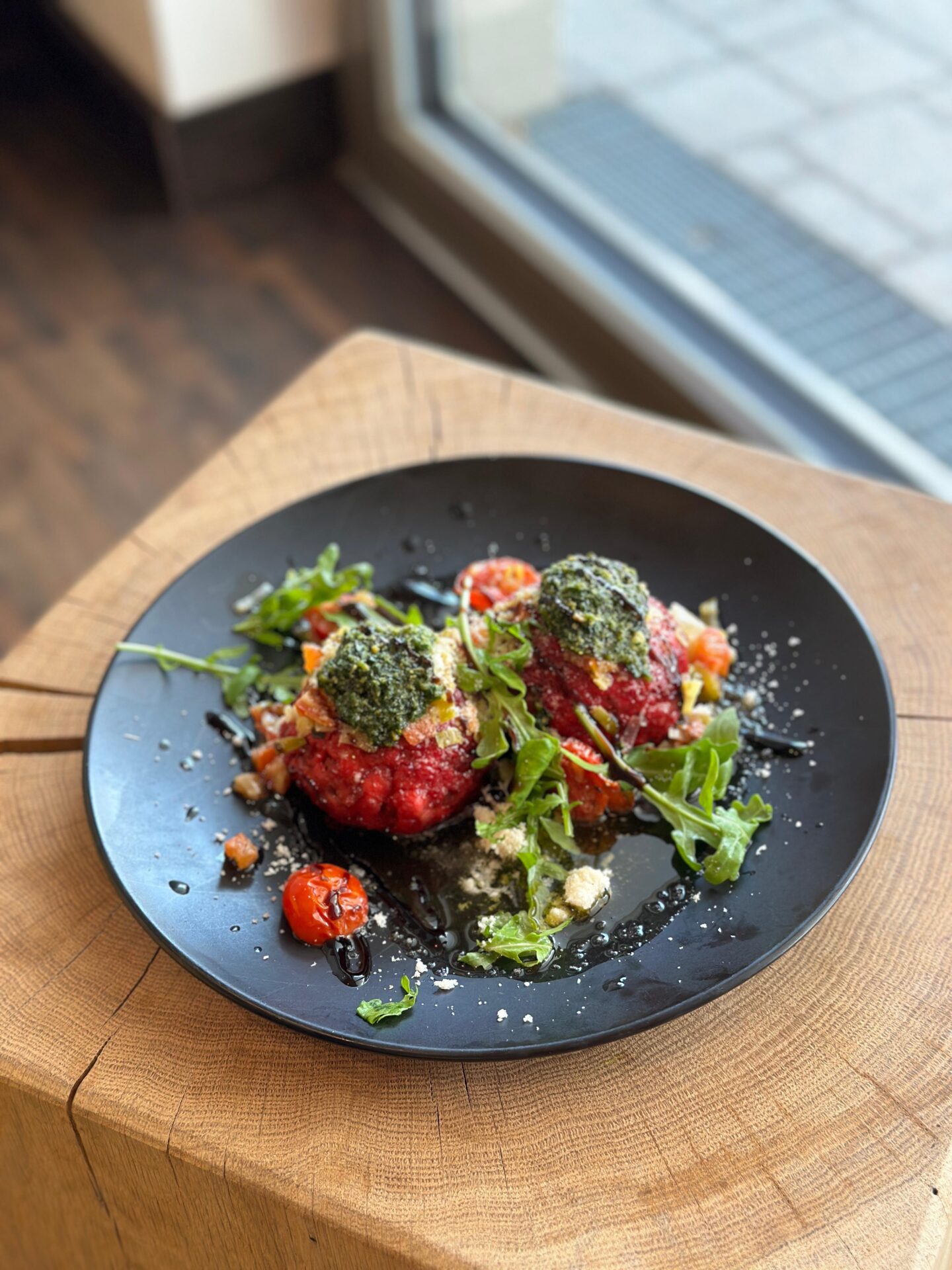 - Den Saft der roten Bete mit etwas Butter (sorgt für schönen Glanz!) aufkochen und mit Balsamico Creme abschmecken. Die fertigen Knödel darin drehen und dann mit brauner Butter und Parmesan anrichten.
