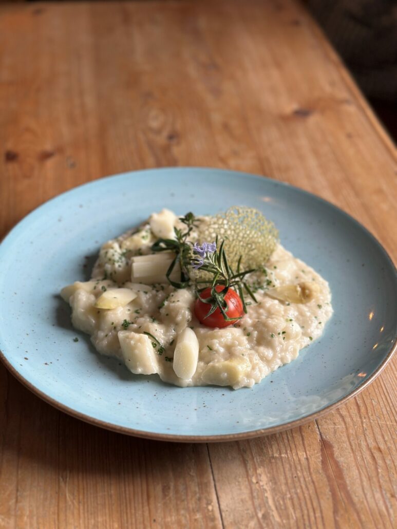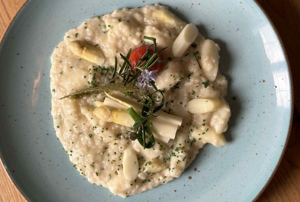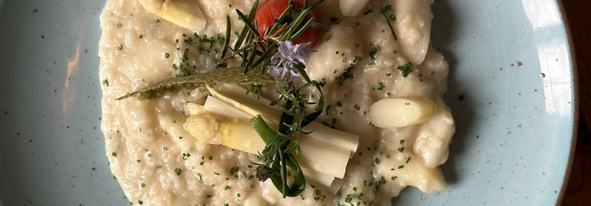 Im Frühling dreht sich im Achental vieles um frischen Spargel – so auch in diesem leckeren, vegetarischen Rezept von Dominik Müller und Annemarie Pletschacher vom traditionsreichen Gasthof Zellerwand in Mettenham/Schleching. Das cremige Spargelrisotto vereint regionale Zutaten mit raffiniertem Kochhandwerk und bringt den Geschmack der Saison direkt auf den Teller.