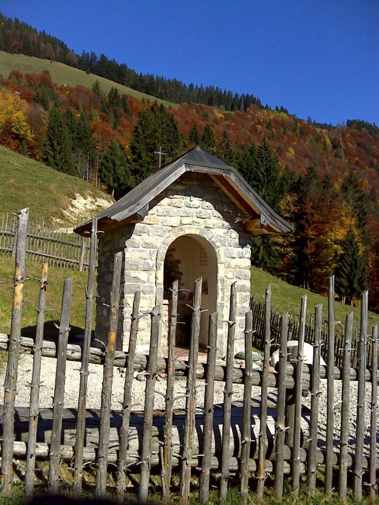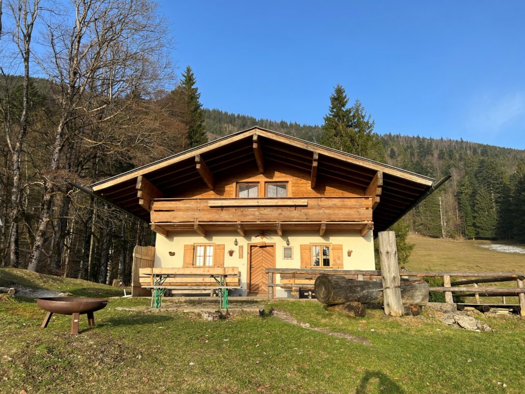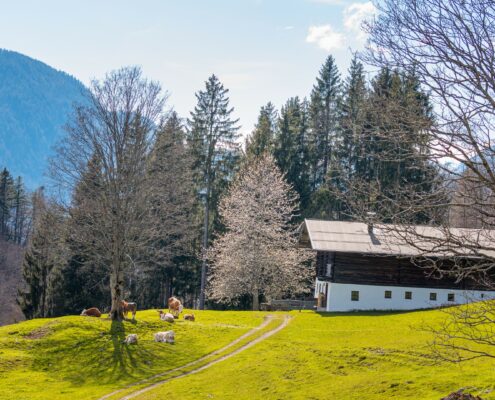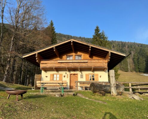 genossen werden – bestehend aus frisch zubereiteten kräftigen Käs- und Speckbretteln oder auch Suppen mit Knödeln oder Pfannkuchen. Frisch gestärkt kann nun der Rückweg angetreten werden. Auf der Forstraße oberhalb der Feldlahnalm geht der Weg Richtung Rechenbergalm und Burgau auf einen Höhenweg mit schönen Ausblick auf das Kaisergebirge weiter. Beim Abzweig kurz vor Burgau, den Forstweg links über die Kapelle ins Tal Richtung Oberwössen nehmen.