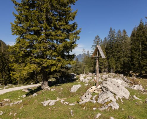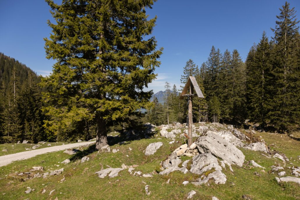 Nach einer Ruhepause und einer Stärkung machen wir uns wieder auf den Rückweg und gehen zunächst die Forststraße ein gutes Stück bergab Richtung Parkplatz Geigelstein.
