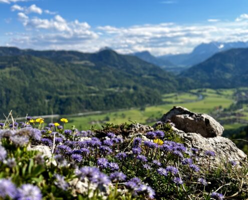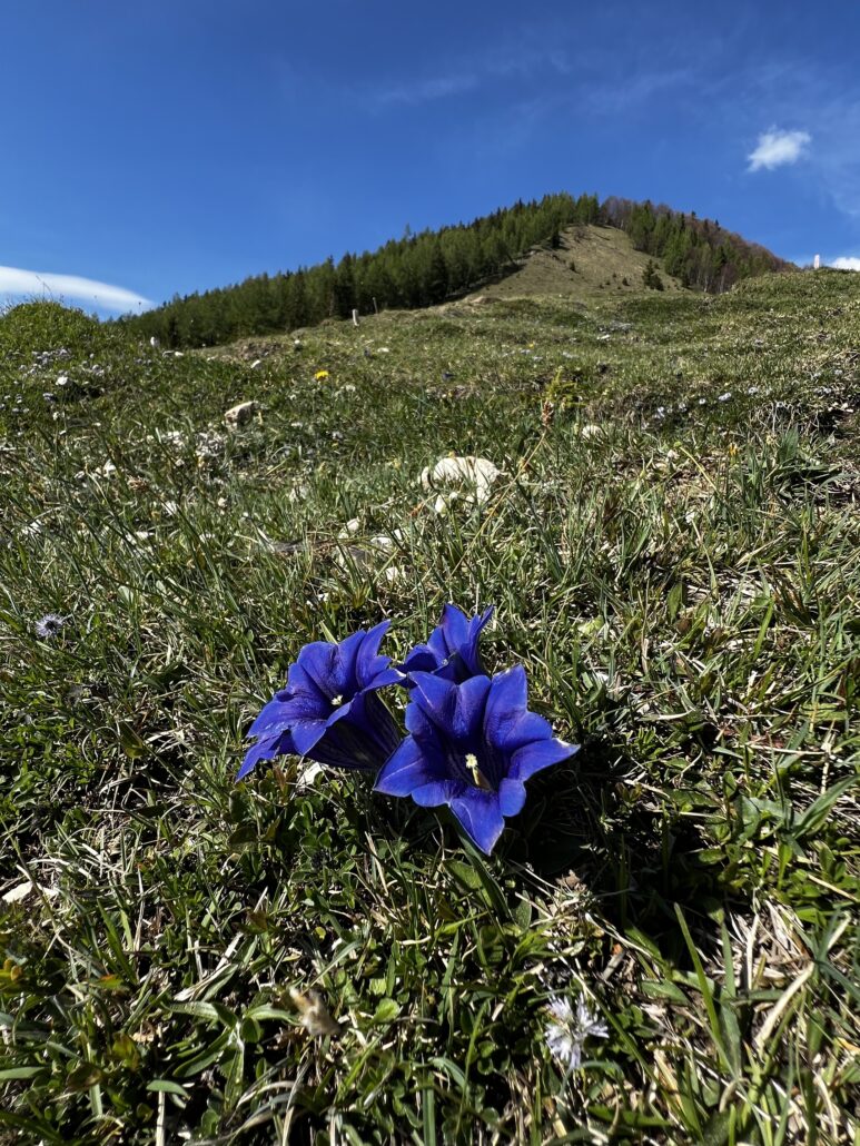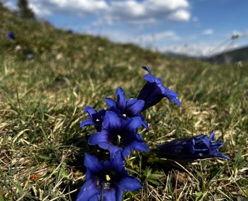 Ein Aufstieg an der Almfläche hoch zum Brunst-Spitz ist zwar etwas anstrengender aber sehr lohnenswert, weil die Aussicht vom Brunst-Spitz noch schöner wird. Die Alm ist in den Sommermonaten von den herzlichen Sennerinnen Seniorbäuerin Mare und ihrer Tochter Erika bewirtschaftet und versorgt. Wanderer und Bergsteiger am Wochenende sowie an Feiertagen mit leckeren Brotzeiten und köstlichen, selbstgemachte Oimnussn. Bestens gestärkt kann nun der Rückweg angetreten werden. Wer möchte, geht noch bis zum Kreuz etwas oberhalb der Hütte und genießt die tolle Aussicht. Anschließend folgt man der Forststraße hinter der Alm zurück ins Tal. Für Naturliebhaber lohnt sich die Wanderung zur Oberauerbrunst-Alm besonders zu Beginn des Almsommers im Mai, denn zu dieser Zeit blüht rund um die Almhütte der stengellose Enzian und verwandelt die Wiesen, in ein blaues Blütenmeer. Neben weiteren Frühlingsblumen, wie der pink gefärbten Mehlprimel, und der lila-farbenen herzblättrigen Kugelblume sind auch sein kleiner Verwandter, der Frühlings-Enzian (unter den Einheimischen besser bekannt als “Schusternagerl”), an vielen Stellen zu finden.