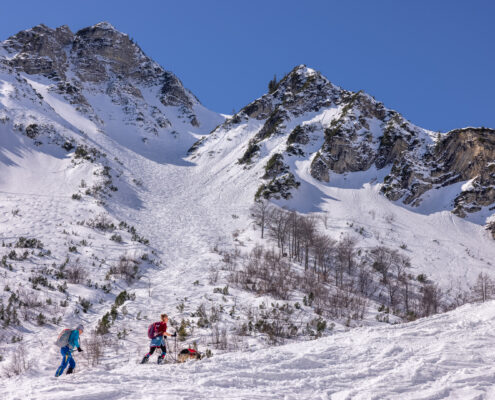 Von dort geht es linker Hand hinauf auf den Kamm. Anschließend führt die Route links abzweigend über die sogenannte Käferlschneid zur Gipfelkuppe mit dem Kreuz. Die Abfahrt erfolgt wie der Routenaufstieg.