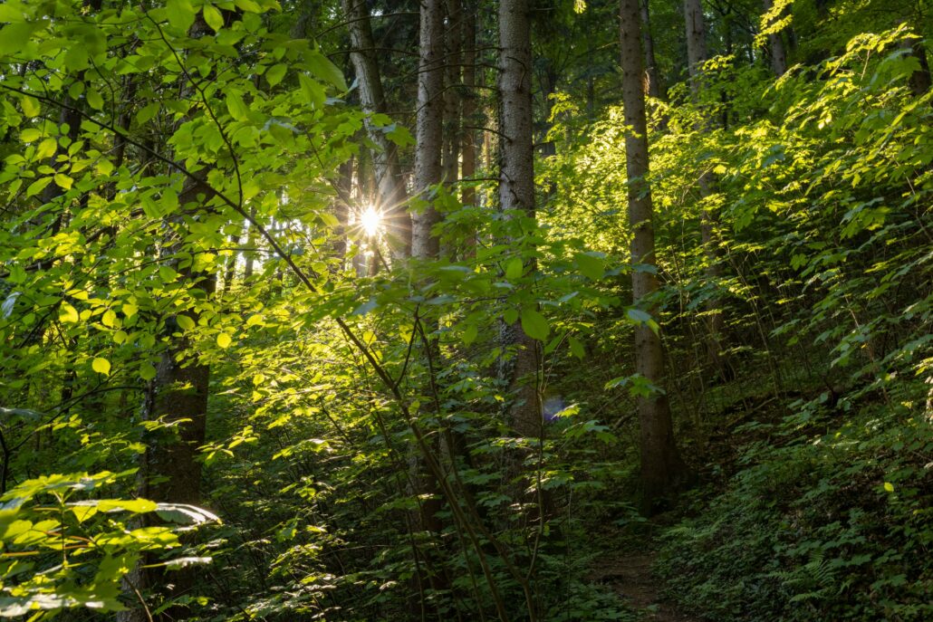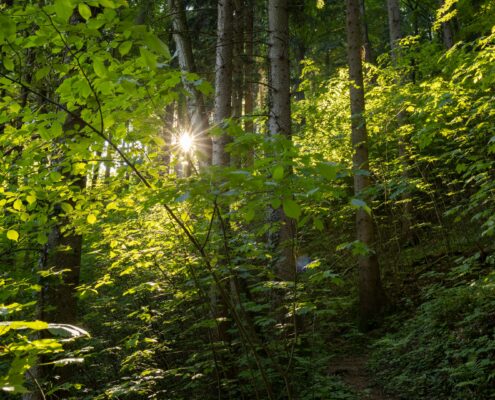Zurück am Forstweg folgen wir ihm noch ein Stück bergauf und biegen dann links auf einen Waldpfad ab. Der Beschilderung Richtung Raiten folgend, erreichen wir erneut eine Forststraße, auf der es links bergab nach Raiten geht.