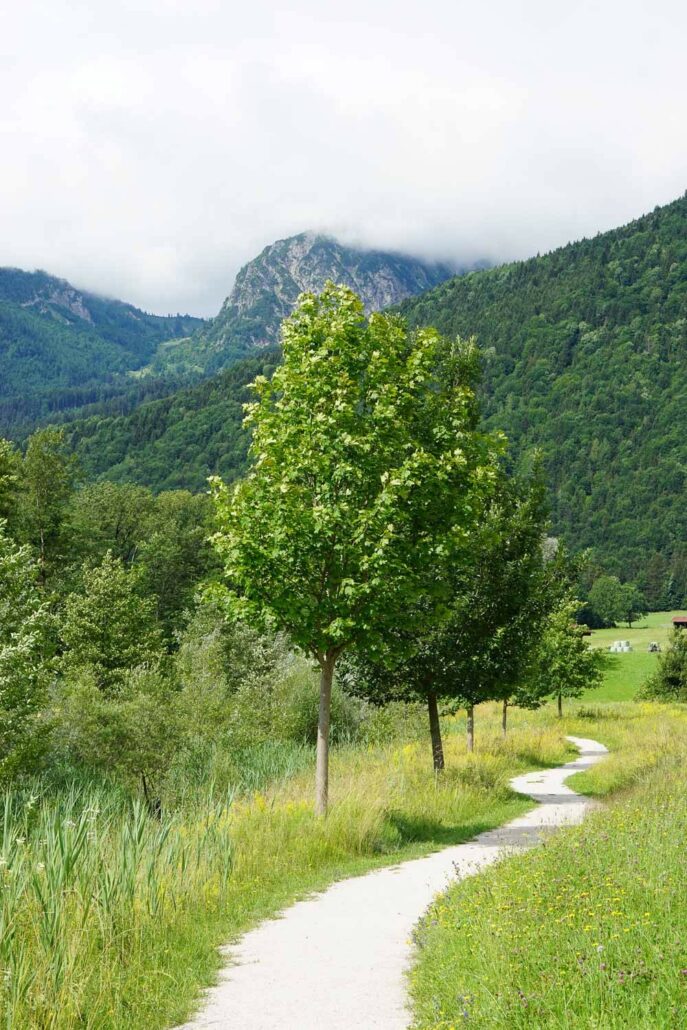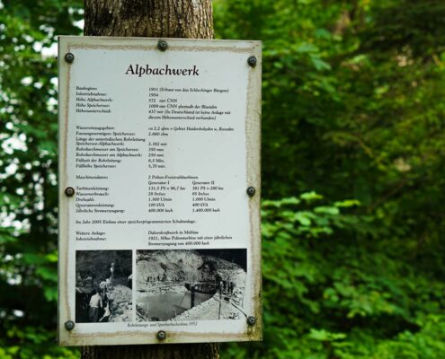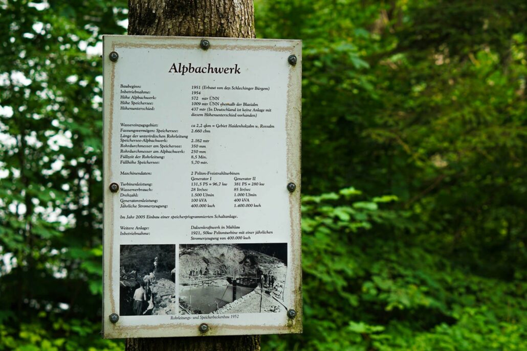 Besonderheiten: Infotafeln zur Historie des Schlechinger E-Werks am Alpbach; Biber am Alpbach; Trimm-Dich Fitnessgeräte; Aussichtspunkt gegen Ende mit herrlichem Blick auf Schleching, den Hochgern sowie die Gscheuerwand