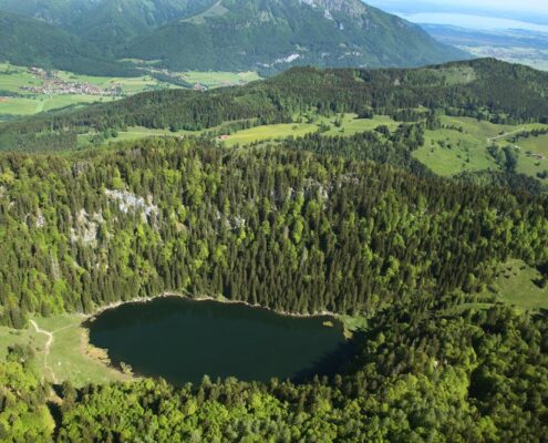 Beschreibung: Startpunkt ist der Parkplatz Geigelstein in Ettenhausen. Nach einer kurzen Wanderung über die Straße führt der Weg hinauf zum Parkplatz Achberg Richtung Streichenkirche und Berggasthof am Streichen. Nun führt der Anstieg zunächst durch ein ausgedehntes Almgebiet. Der steile „Kroatensteig“ leitet dann über den Sattel an der „Rauhen Nadel“ und hinunter zum Taubensee und zur deutsch-österreichischen Grenze, markiert von einem alten Grenzerhäuschen. Nach ein paar Minuten ist die Taubenseehütte (1165 m) erreicht. Hoch über dem Talkessel von Kössen gelegen, erwartet sie ein herrlicher Panorama-Blick die auf die vielgerühmte Aussicht auf Zahmen (2001m) und Wilden Kaiser (Höchster Punkt – Ellmauer Halt mit 2.344m). Von da an geht es dann hinab zum Nachbarort Kössen/Tirol an die dortige Tourist-Info. Dort steigen wir an der Bushaltestelle “VZ Kaiserwinkl” in den Bus der Linie 9509 in Richtung Schleching. Nach kurzer Fahrt erreichen wir die Zielhaltestelle “Ettenhausen Zollamt”.