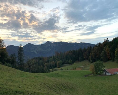 rechts abbiegen und die Forststraße bergauf folgen. Bei der bewirteten Chiemhauser Alm eine verdiente Brotzeit-Pause machen mit schönem Ausblick auf den Schlechinger Geigelstein, oder die Alm links liegen lassen und immer entlang des