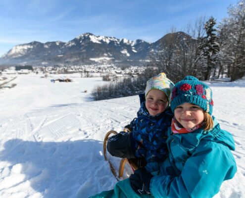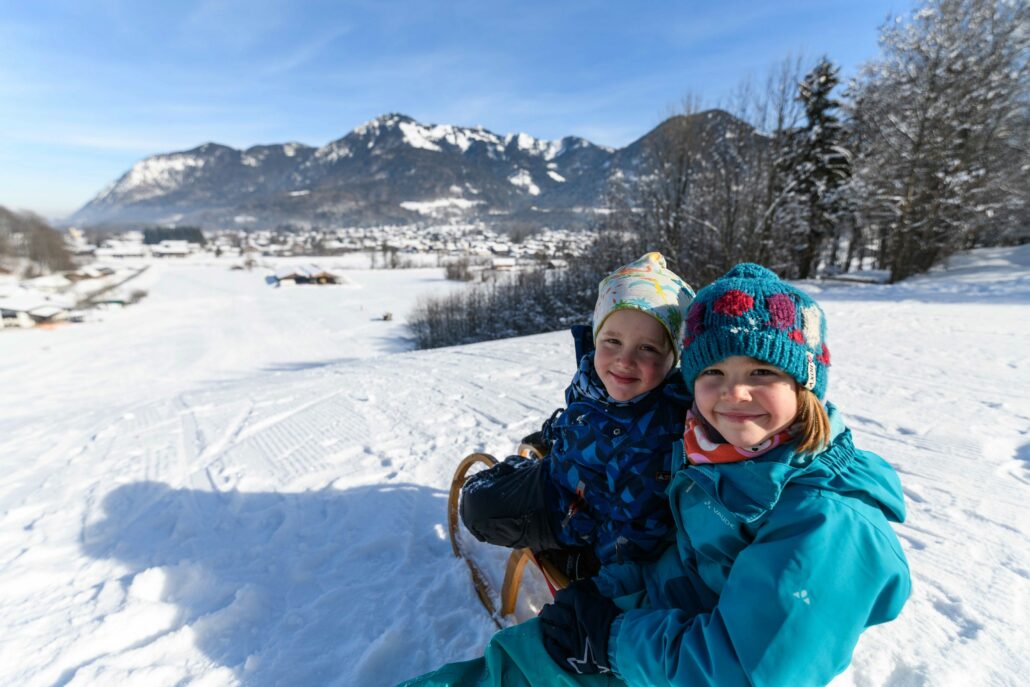 Vom Wanderparkplatz Hochgern zur Agersgschwendt Alm wandern und mit dem Schlitten wieder herunter fahren.