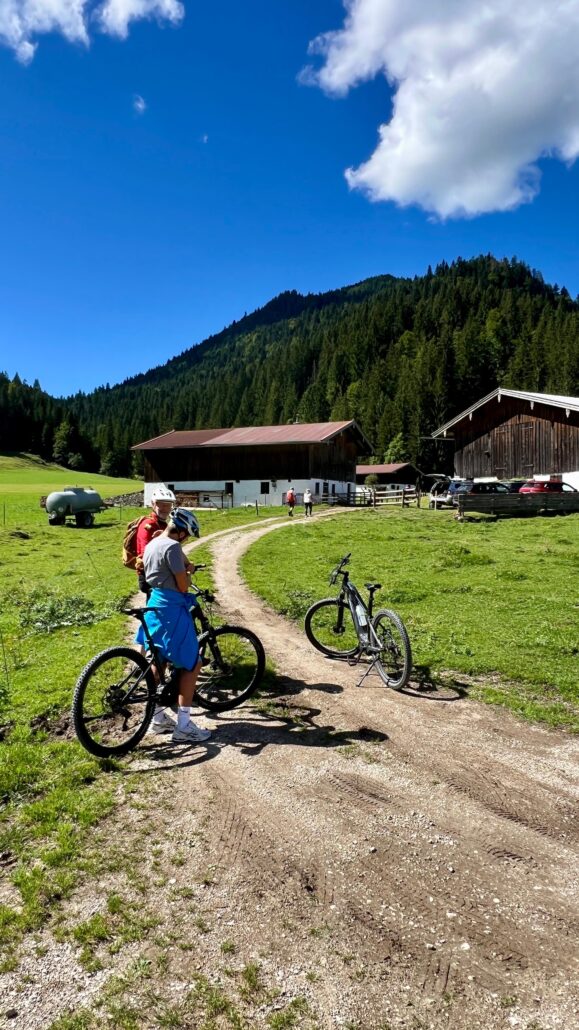 Nun folgt die Abfahrt auf breiter Forststraße hinunter zu den Röthelmoosalmen – eine offene Almfläche, die an schönen Tagen ein fast schon alpines Panorama bietet. Unten angekommen, hält man sich links weiter rollend, geht es auf der Forststraße wieder bergan Richtung Jochbergalmen. Der Anstieg ist fordernd, aber gut zu fahren, und oben öffnet sich erneut ein weiter Blick über das Achental.