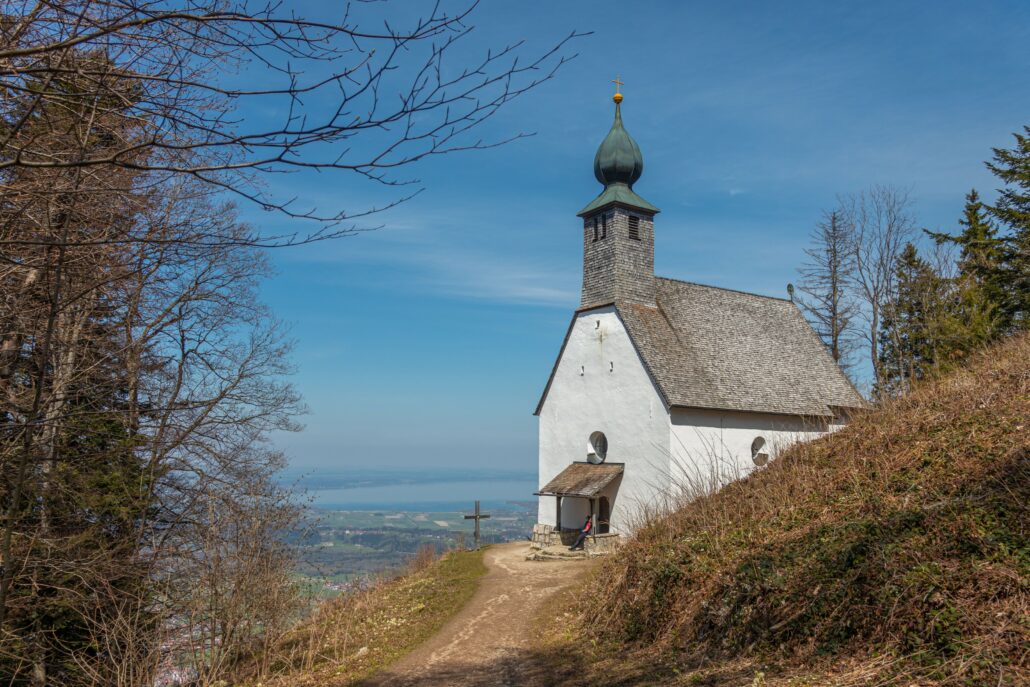 Nicht nur mit seiner Historie punktet dieser mystische Ort, sondern auch – für manchen sogar vor allem – mit der Aussicht, die man auf den Bänken vor der Schnappenkirche genießen kann. Bis hinunter nach Marquartstein und bis weit über den Chiemsee hinaus sieht man an klaren Tagen. Das Talpanorama ist überwältigend und deshalb bietet sich dieser Ort für eine ausgiebige Rast an. Man hat einen Blick auf Grassau und überhalb der Tiroler Achen auf das Naturschutzgebiet Kendlmühlfilze. Dieses Naturjuwel ist das größte Hochmoor im südostbayerischen Raum und sollte als Ausflugsziel unbedingt vorgemerkt werden. Besonders im Frühsommer, wenn das Wollgras mit seinen weißen Blütenständen, die ihm seinen bildstarken Namen gegeben haben, die Landschaft überzieht. Rechts neben dem deutlich erkennbaren Naturschutzgebiet Kendlmühlfilze gibt es ein weiteres Naturschauspiel zu sehen: Das Achendelta, an dem die Tiroler Ache in den Chiemsee mündet. Es gilt als das am besten ausgebildete Binnendelta Mitteleuropas.
