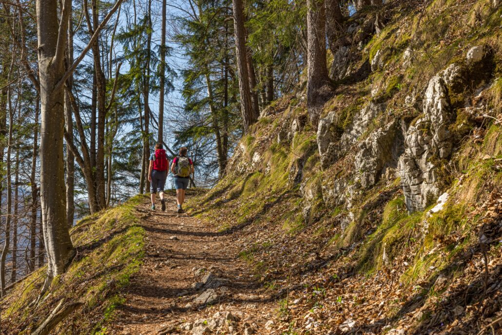 Schließlich wird der Boden unter den Wanderstiefeln immer felsiger, kleine Steine und größere, moosbewachsene Findlinge liegen umher, der Steig wird ausgewaschen – und plötzlich strahlt in der Ferne das glatte Weiß der Schnappenkirche (1100 m) durch die weiten Hallen der Baumstämme.