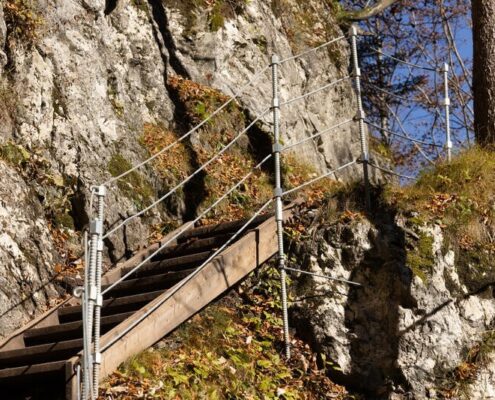 ein Bus (RVO-Linie 9509) zurück in Richtung Schleching. Für alle anderen führt der Weg von hier Richtung Kössen vorbei an zwei Aussichtsplattformen, Wasserfällen und Ruhebänken zur Teufelsstiege. Über diese gelangt man wieder direkt an die Tiroler Ache und von dort über befestigte Wege und Straßen weiter nach Kössen und zur Bushaltestelle in der Ortsmitte.