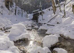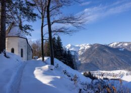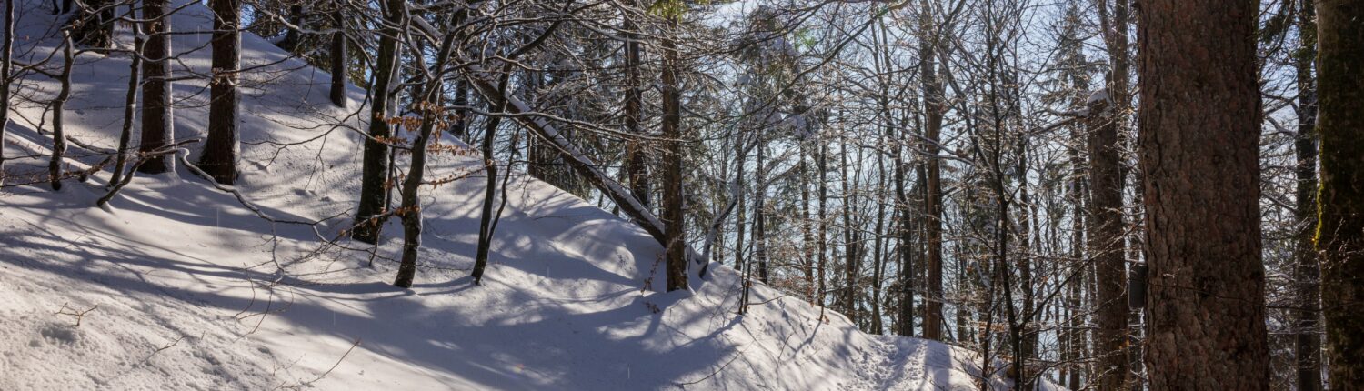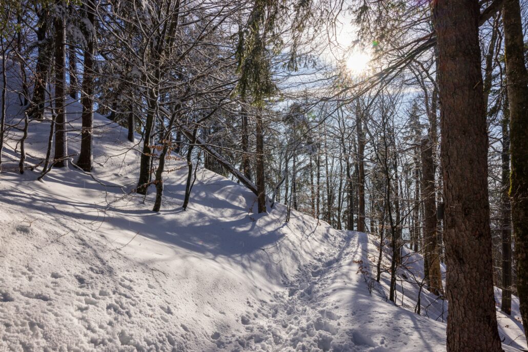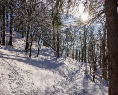 Beschreibung: Die mittelschwere Wanderung verläuft abseits der Massen zumeist durch den Wald. Wir starten in der Au in Schleching am Wanderparkplatz und folgen der Beschilderung Richtung Haidenholzalm. Durch den Winterwald steigt der Weg auf den ersten 2 km an und bietet immer wieder schöne Ausblicke auf Schleching. Auf Höhe der Blasialm zweigen wir an der Wegkreuzung links Richtung Parkplatz Geigelstein / Ettenhausen ab. Hier führt ein breiter Pfad durch den Wald zuerst bergab, dann auf ebener Strecke am Knogler-Lahner-Steig vorbei und steigt nun nochmals leicht an. Oben stoßen wir auf einen Forstweg, dem wir links bergab weiter Richtung Geigelstein Parkplatz folgen. Nach weiteren 20 – 30 Minuten kommen wir an einen Abzweig und biegen dort links ab. Wir folgen dem Weg am Schneiderhanggraben entlang – Achtung auf diesem Streckenabschnitt können Rodler von oben kommen. Nach ca. 10 Minuten biegen wir links ab, überqueren die Brücke und sind kurz darauf am Zielpunkt, dem Geigelstein Parkplatz.