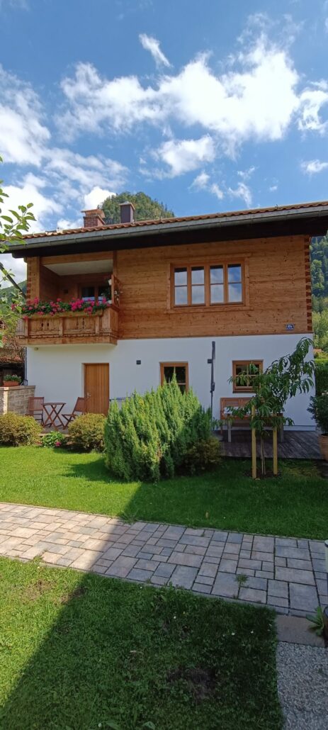 Das neu renovierte Haus, das im Jahr 2024 fertiggestellt wurde, strahlt eine harmonische Verbindung von modernem alpenländlichem Stil und traditionellem Charme aus. Die Fassade ist mit hochwertigem gehacktem Altholz verkleidet, das nicht nur für eine warme, einladende Atmosphäre sorgt, sondern auch die regionale Handwerkskunst widerspiegelt.