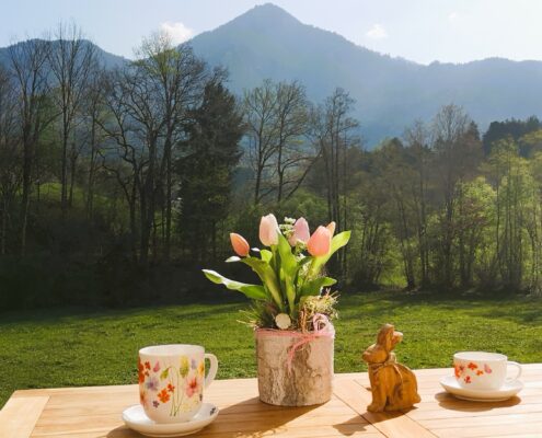 Von der Terrasse aus haben Sie einen freien Blick in die wunderschöne Natur und die Berge. Die angrenzende Streuwiese birgt einen wahren Schatz an seltenen Blumen, Orchideen und Kräutern. Ein wahrer Balsam für Ihre Seele.