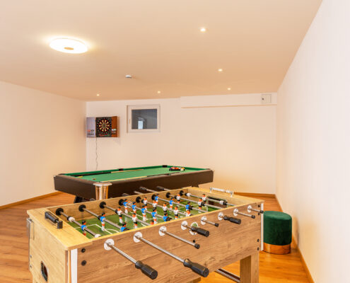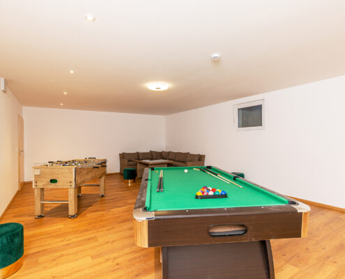 Im Keller wartet auf Sie ein 40 m2 großer Freizeitraum wo Sie Billard, Kickern oder Dart spielen können, natürlich auch mit einem gemütlichen Sitzbereich zum beisammensitzen.