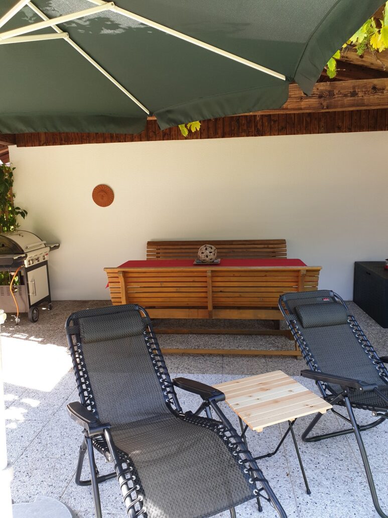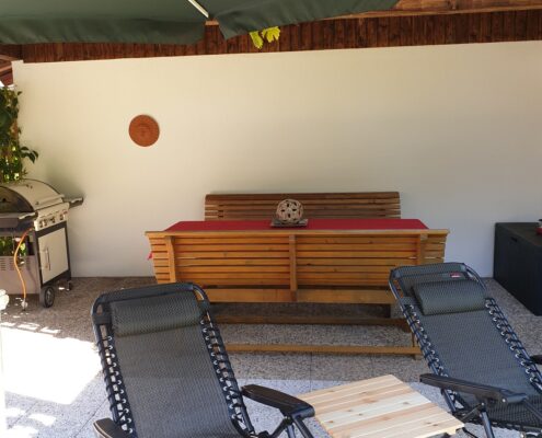 Die Ferienwohnung wurde 2020 komplett neu renoviert. Im Garten steht Ihnen ein großer Freisitz mit Tisch, Bänken, Komfort-Liegesessel und Hauben-Gasgrill zur Verfügung! Sie haben in der Wohnung und auch im Freisitz kostenlosen Zugang zu unserem schnellen WLAN-Anschluss der Telekom (Glasfaser-Leitung). Zusätzlich stehen Ihnen auch noch LAN-Anschlüsse in der Wohnung zur Verfügung. Wir haben sehr auf die Hochwertigkeit (z.B. hygienische “Bio-Böden”) und Nachhaltigkeit bei der Auswahl der Baumaterialien und Einrichtung geachtet. Sie sollen sich einfach Wohlfühlen und Ihren Urlaub von Anfang an genießen können. Gerne können Sie auch den Freisitz mit Grillmöglichkeit nutzen, der für Sie exklusiv zur Verfügung steht. Er ist “bestückt” mit einem großen Tisch für 6 – 8 Personen. Ebenso vier Relax-Sessel mit Liegefunktion und zwei Klappstühlen. Für Ihr Grillvergnügen ist ein Gasgrill mit Gussplatten und separater Kochfläche vorhanden. Der Garten ist großzügig und entspannt durch viel “Grün”.