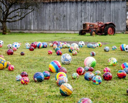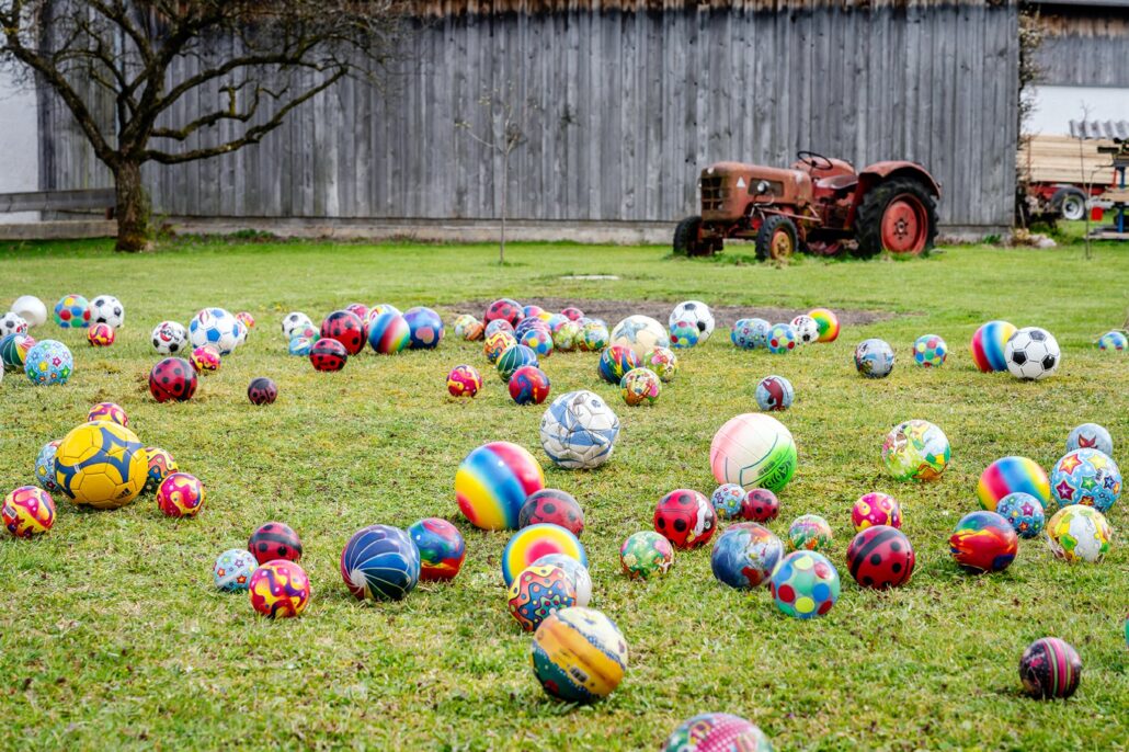 Strahlender Sonnenschein, saftig-grüne Wiesen, Blumen am Balkon und ein Kunstwerk aus rund 200 bunten Bällen auf dem Rasen rund um das Bauernhaus: Mit diesem traumhaften Anblick empfangen wir euch auf unserem Naderbauer-Hof in Piesenhausen, einem Ortsteil der Gemeinde Marquartstein im oberbayerischen Landkreis Traunstein. Wir freuen uns, unseren Gästen ein Stück unserer wunderbaren Heimat abgeben zu können. Gerne teilen wir unser Glück mit euch – sei es auf dem Ferienbauernhof, auf der Niederalm oder auf der Piesenhausener Hochalm bei einer Einkehr. Wir freuen uns auf euch!